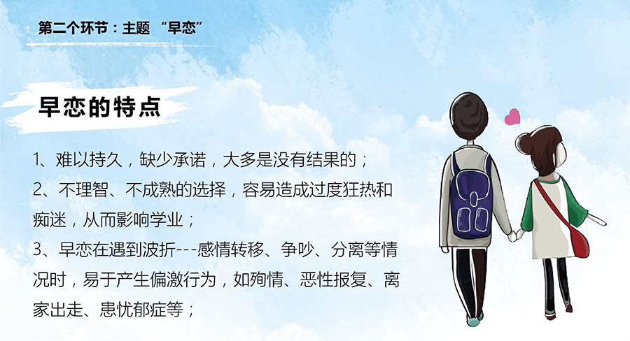 青少年好动好胜,对文体活动、科技活动和各种比赛活动有着广泛的爱好和兴趣。家长和老师都鼓励早恋中的孩子积极参加各种活动,丰富他(她)的精神生活,把兴致、注意、精力都转移到活动中,转移到竞争中,转向渴求知识、发展智力、增强体质方面,转移到追求崇高的精神生活方面上来。